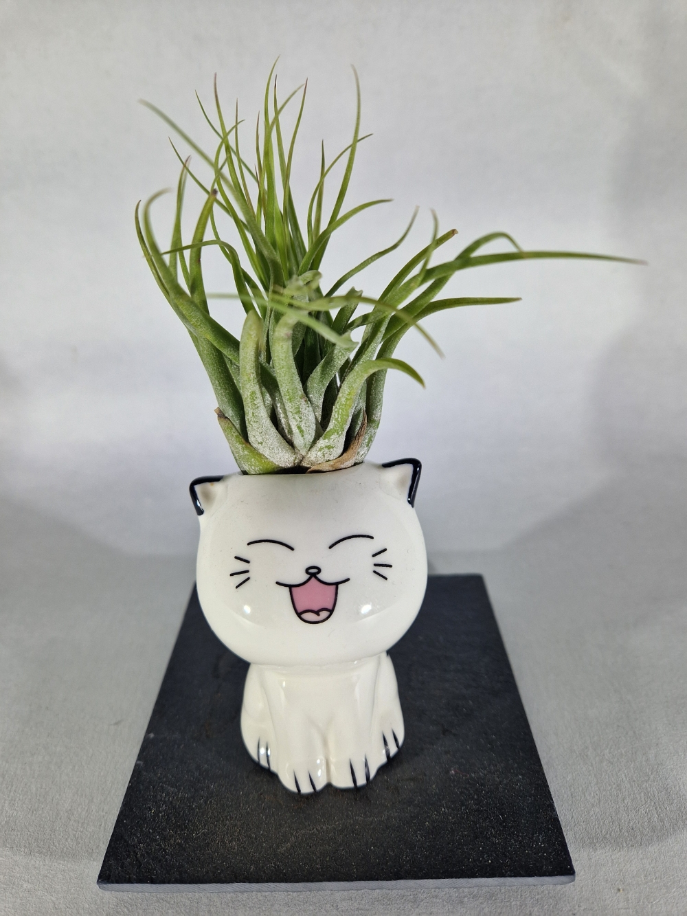un tilland’chat est un chat de 7 cm en porcelaine avec un tillandsia en guise de cheveux
