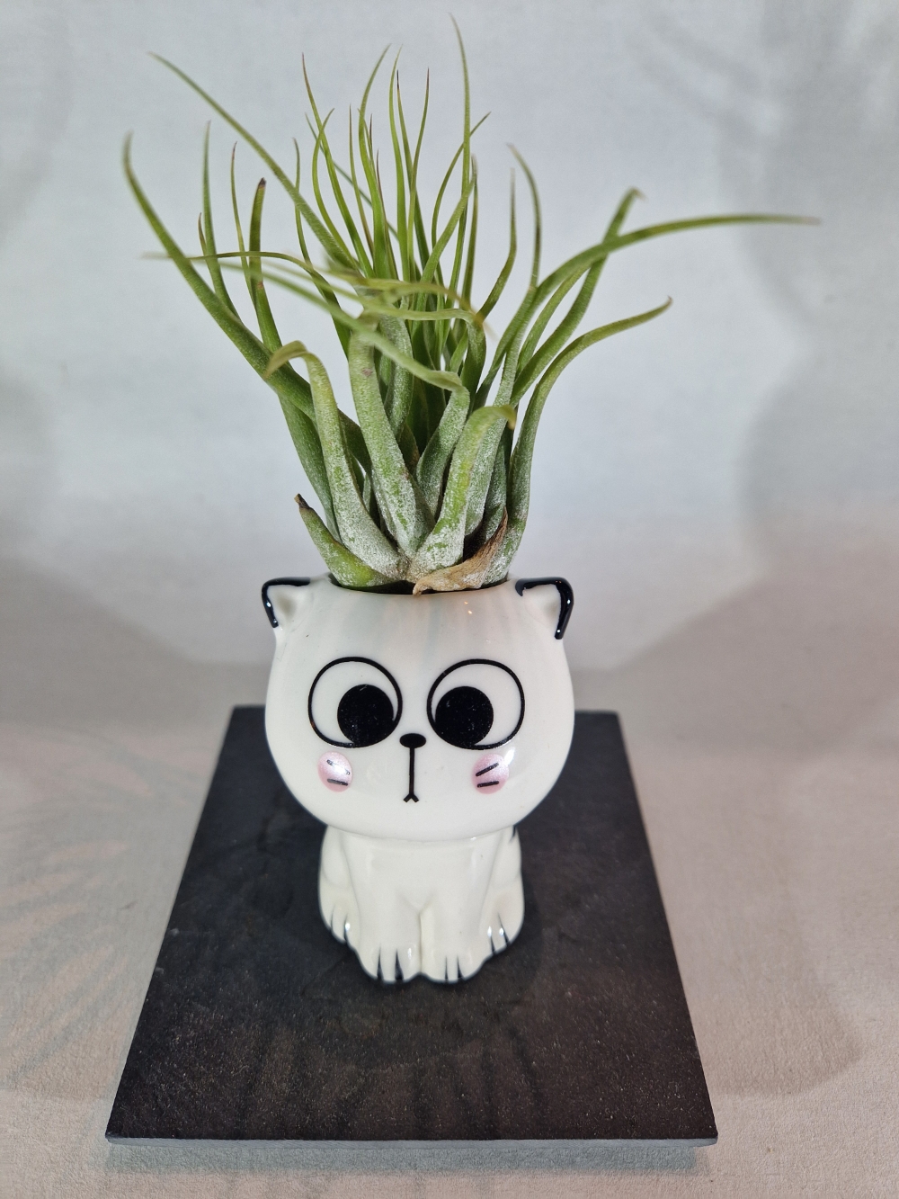 Un tilland’chat est un chat de 7 cm en porcelaine avec un tillandsia en guise de cheveux