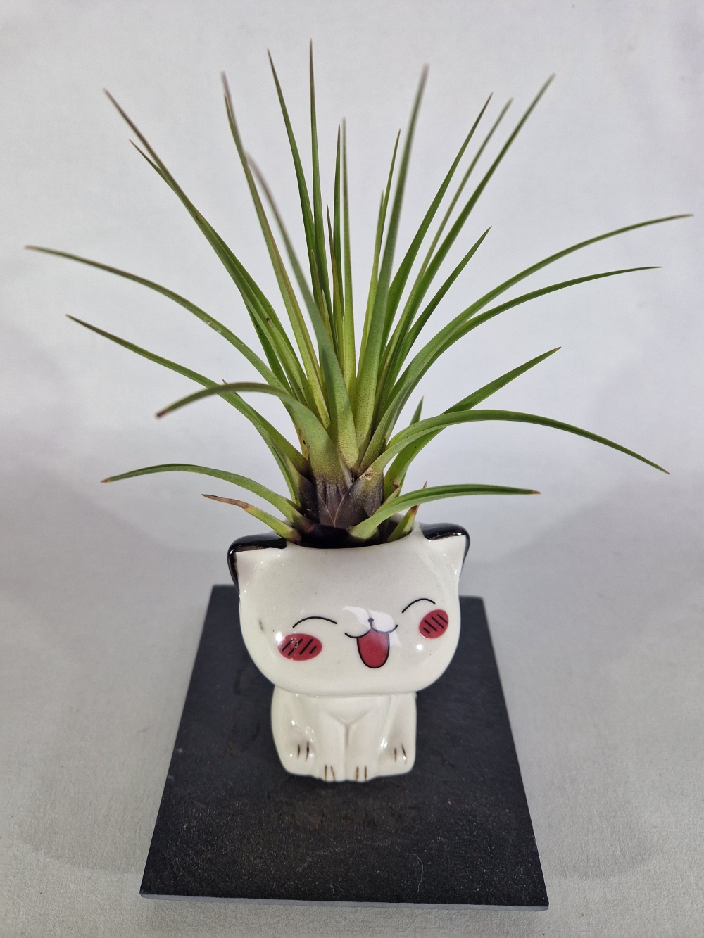 Un tilland’chat  est un chat de 7 cm en porcelaine avec un tillandsia en guise de cheveux