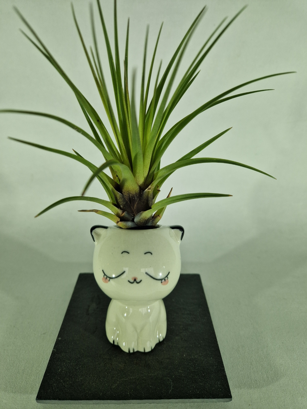 Un tilland’chat  est un chat de 7 cm en porcelaine avec un tillandsia en guise de cheveux