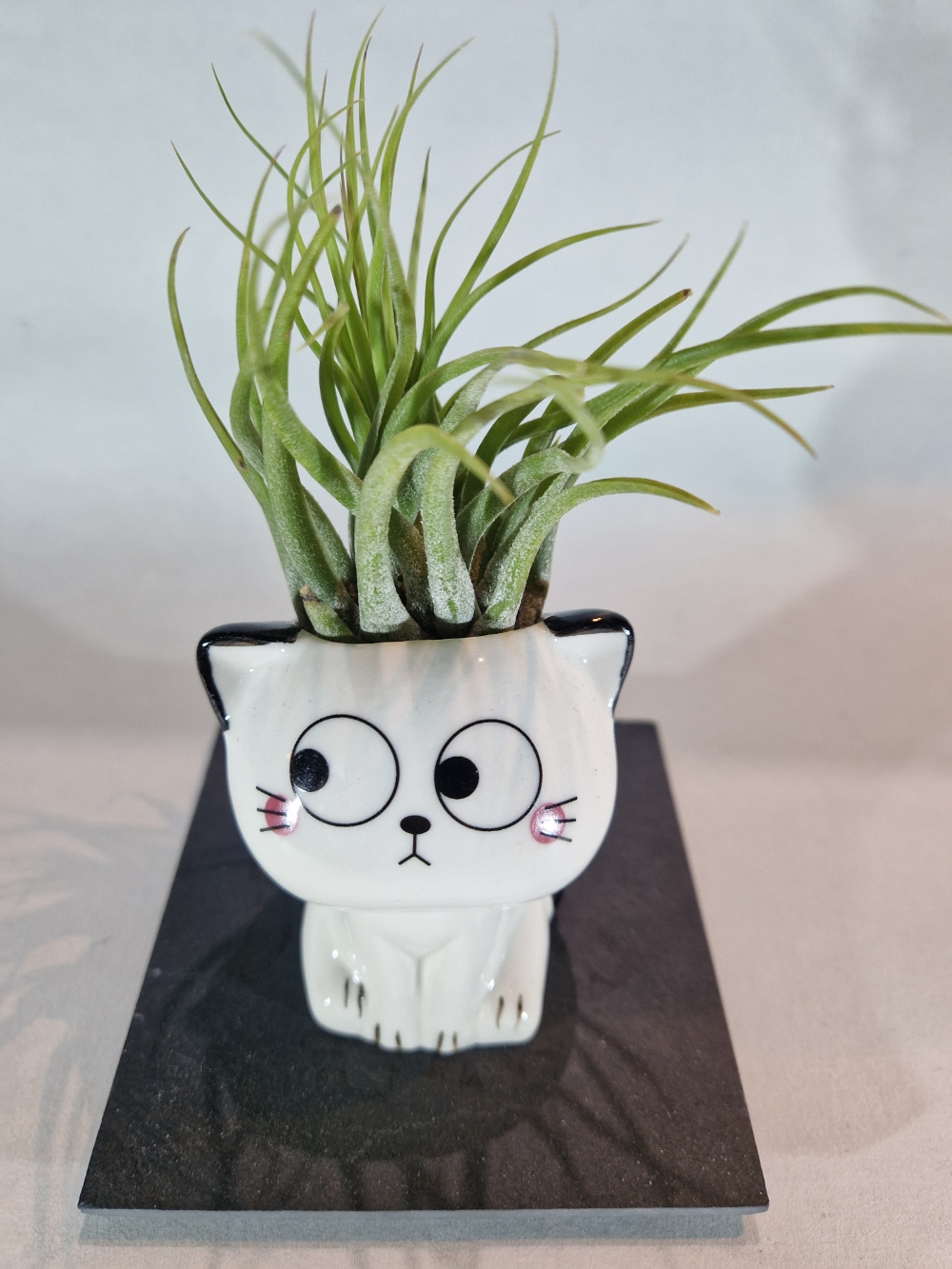 Un tilland’chat  est un chat de 7 cm en porcelaine avec un tillandsia en guise de cheveux