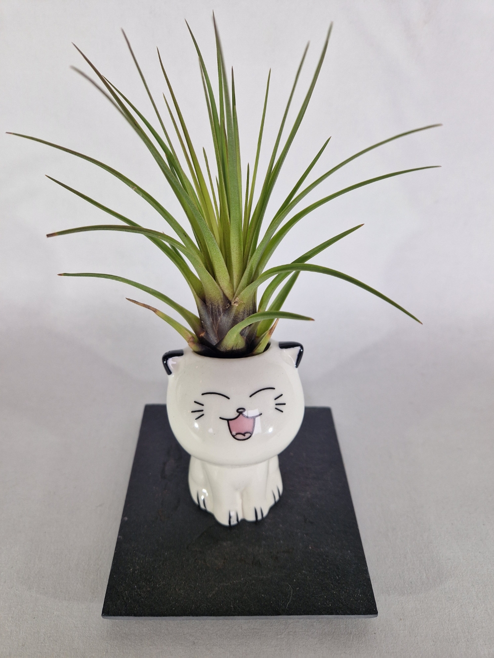 Un tilland’chat  est un chat de 7 cm en porcelaine avec un tillandsia en guise de cheveux