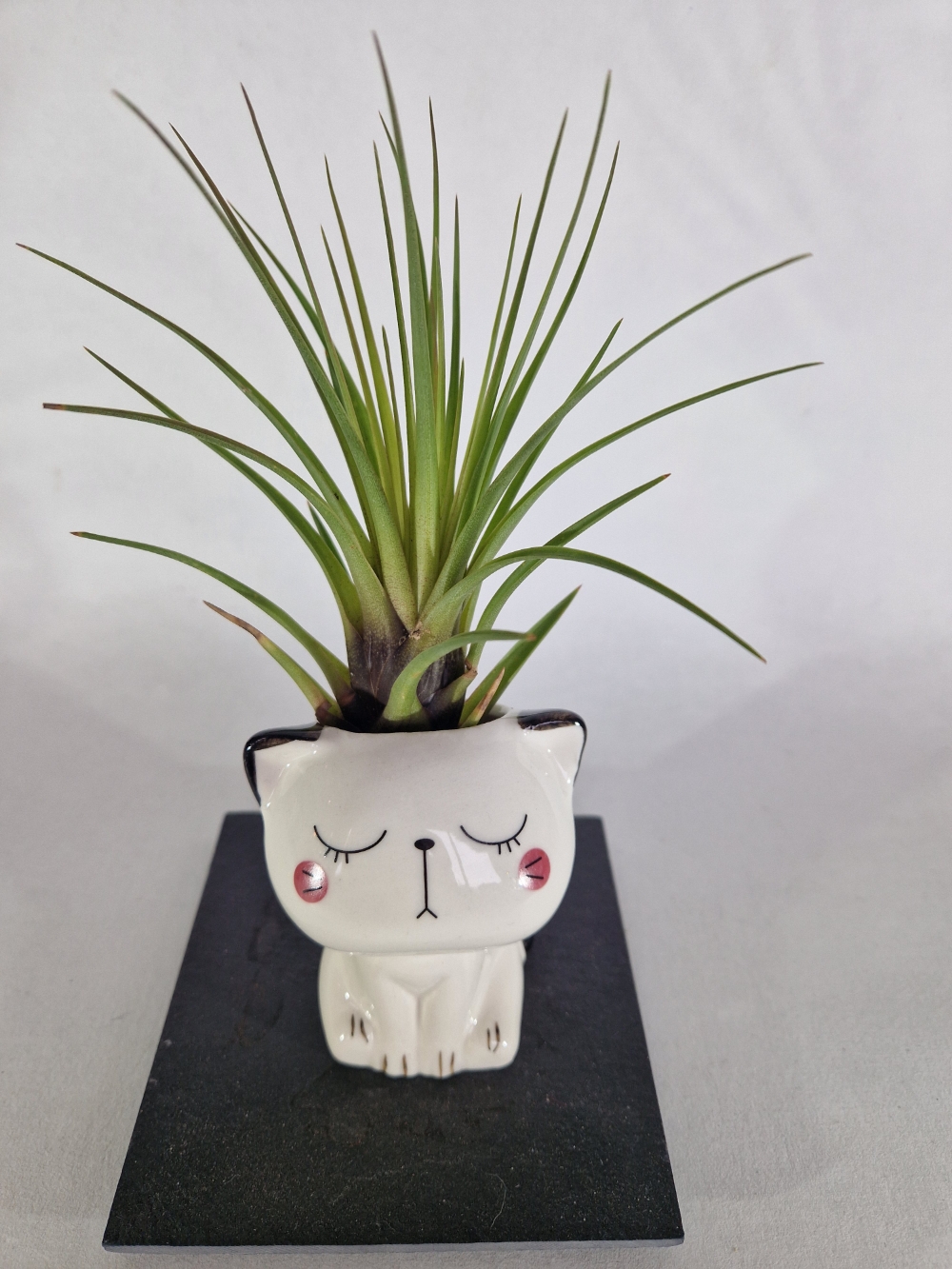 Un tilland’chat est un chat de 7 cm en porcelaine avec un tillandsia en guise de cheveux